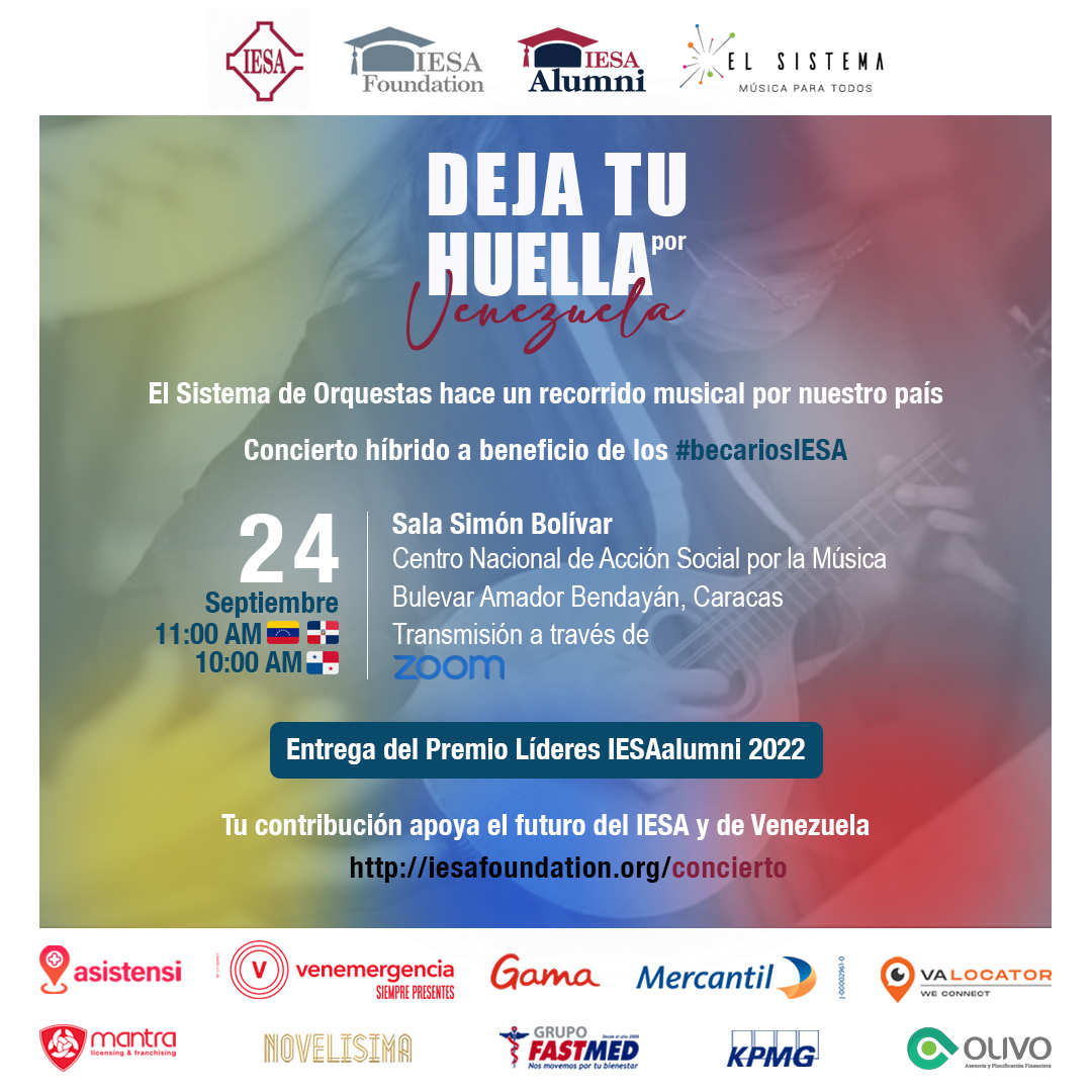 El Sistema, a través de la Orquesta Sinfónica Juan José Landaeta, dirigida por Jesús Uzcátegui, hará un recorrido musical por nuestro país en el Concierto híbrido “Deja tu huella por Venezuela”, una evento de compromiso y celebración que convoca a todos los egresados del IESA en el mundo, a nuestros aliados y al público en general, para el próximo sábado 24 de septiembre a partir de las 10:00 a. m. (Hora Colombia / Panamá) y 11:00 a. m (Hora República Dominicana / Estados Unidos EST / Venezuela)